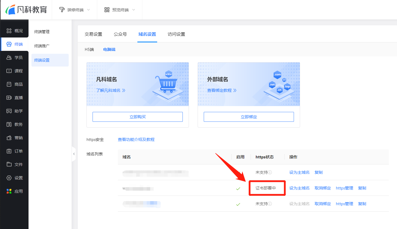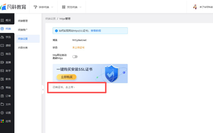 进入教育管理后台,点击需要实现https化域名的【https管理】。
