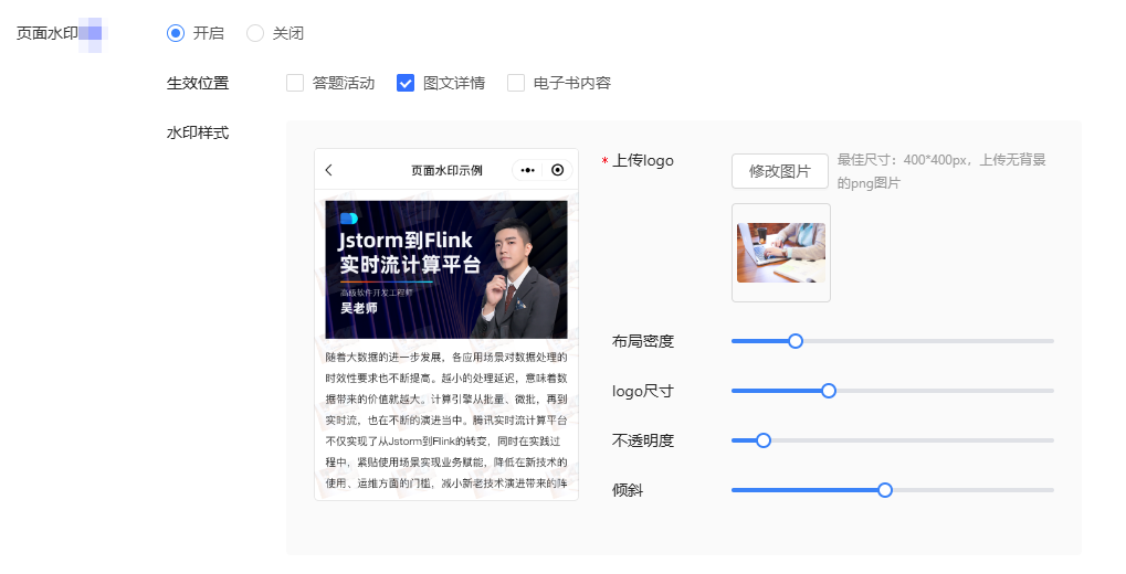 支持答题活动、图文详情、电子书内容设置水印