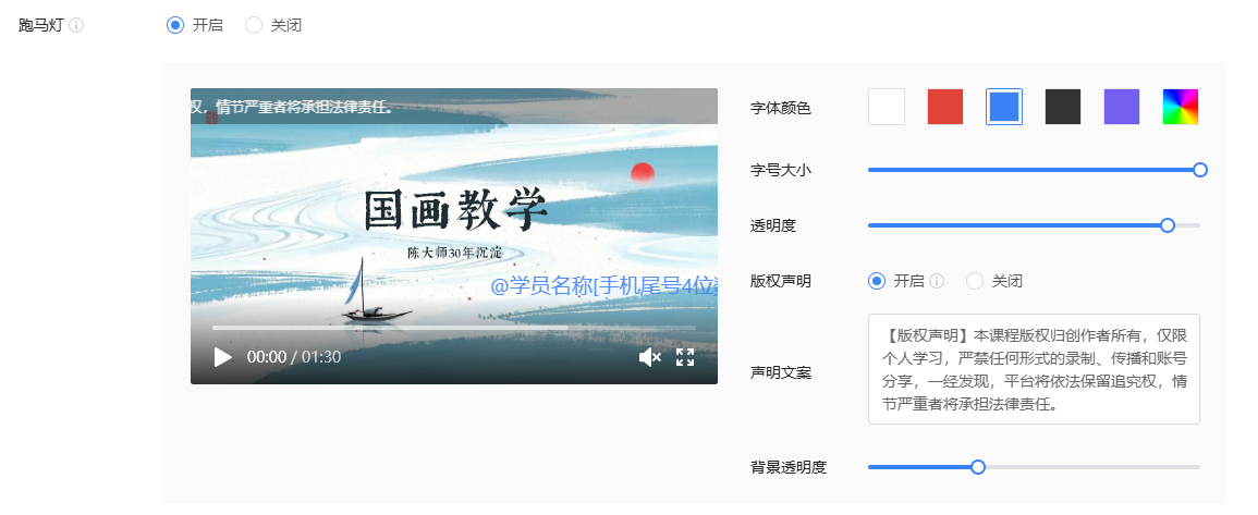 开启之后可以选择跑动的字体颜色、大小、透明度,也支持在顶部支持版权声明。