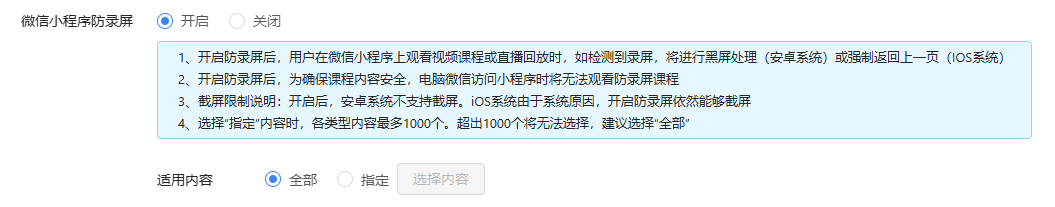 ①开启防录屏后,用户在微信小程序上观看视频课程或直播回放时,如检测到录屏,将进行黑屏处理(安卓系统)或强制返回上一页(IOS系统)