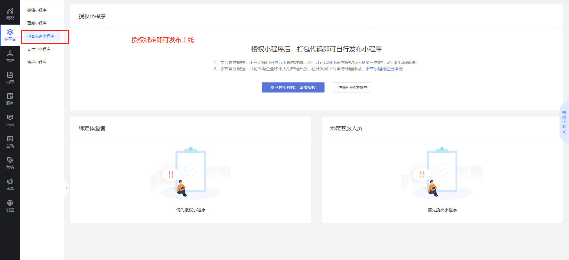 4、设置好之后在终端绑定字节跳动平台,授权即可上线发布了,就是这么简单。