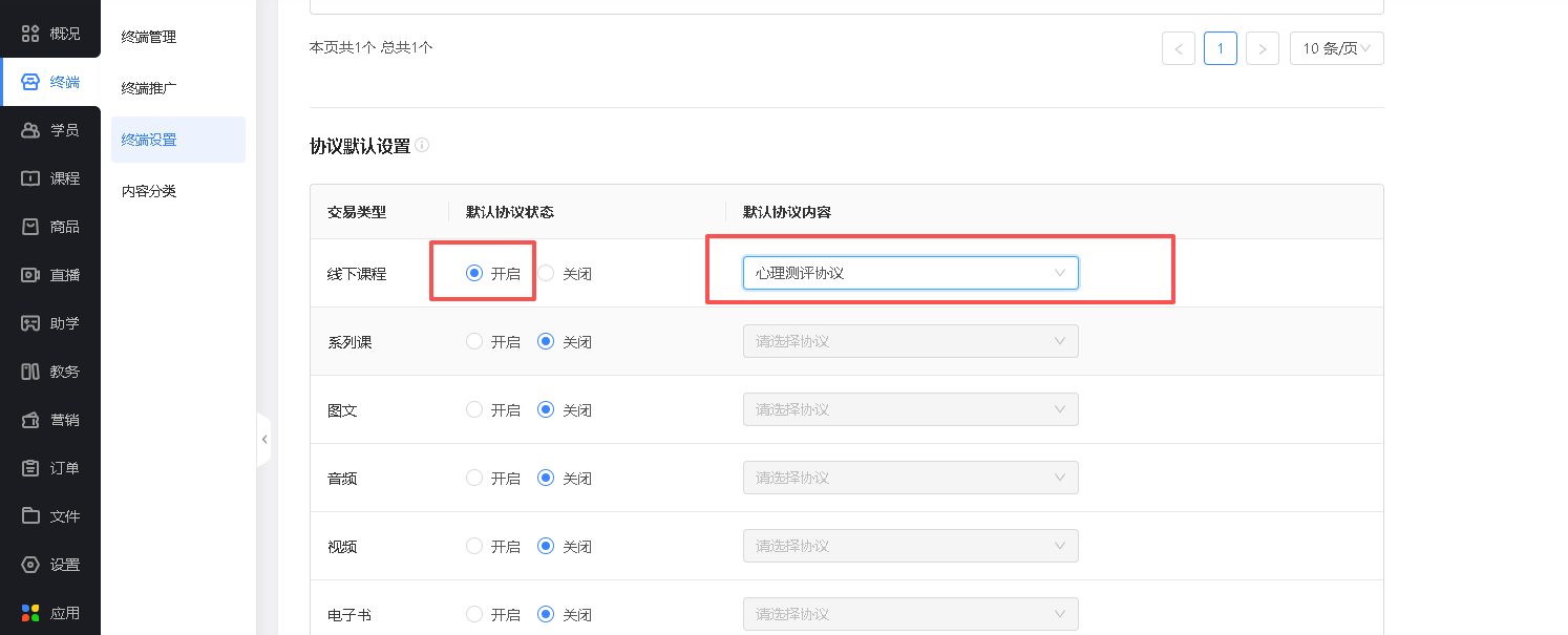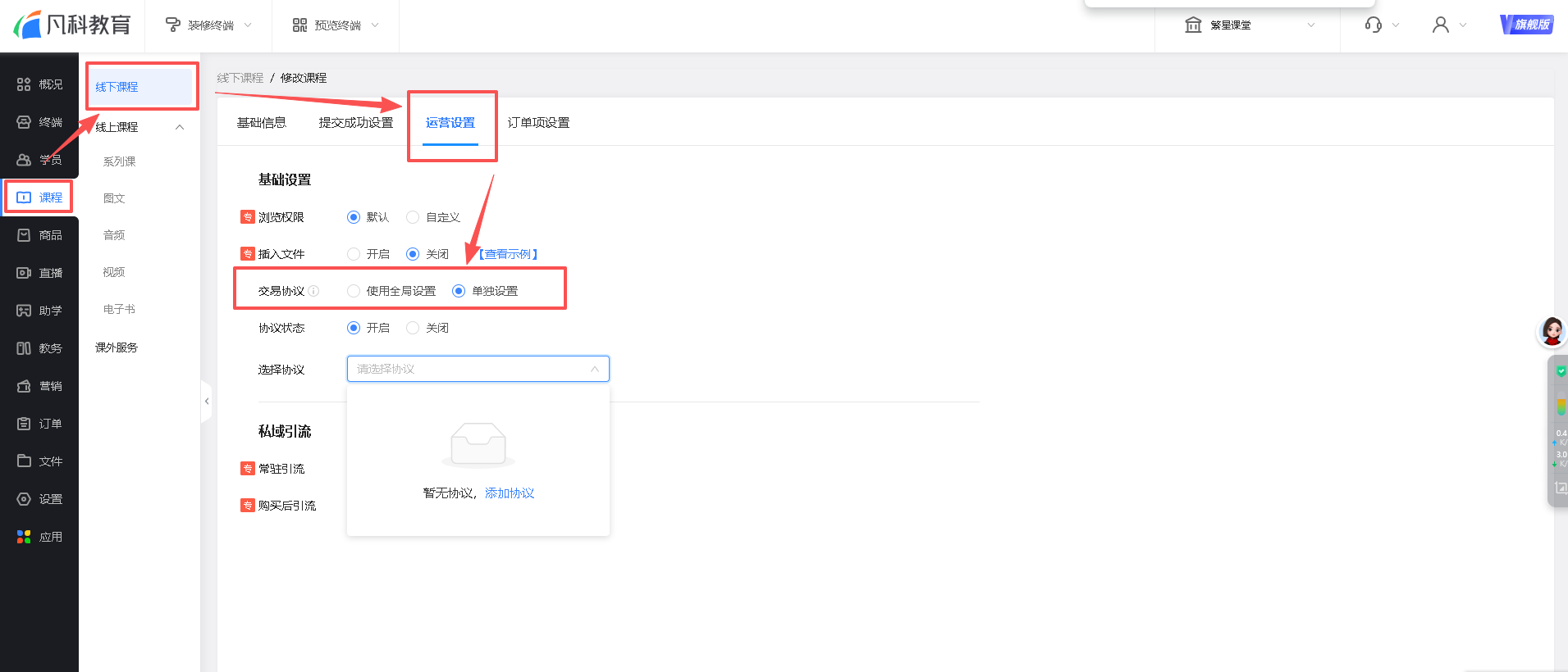 以线下课程为例,进入课程编辑页面,运营设置,选择段单独设置协议