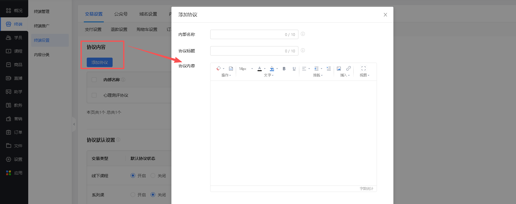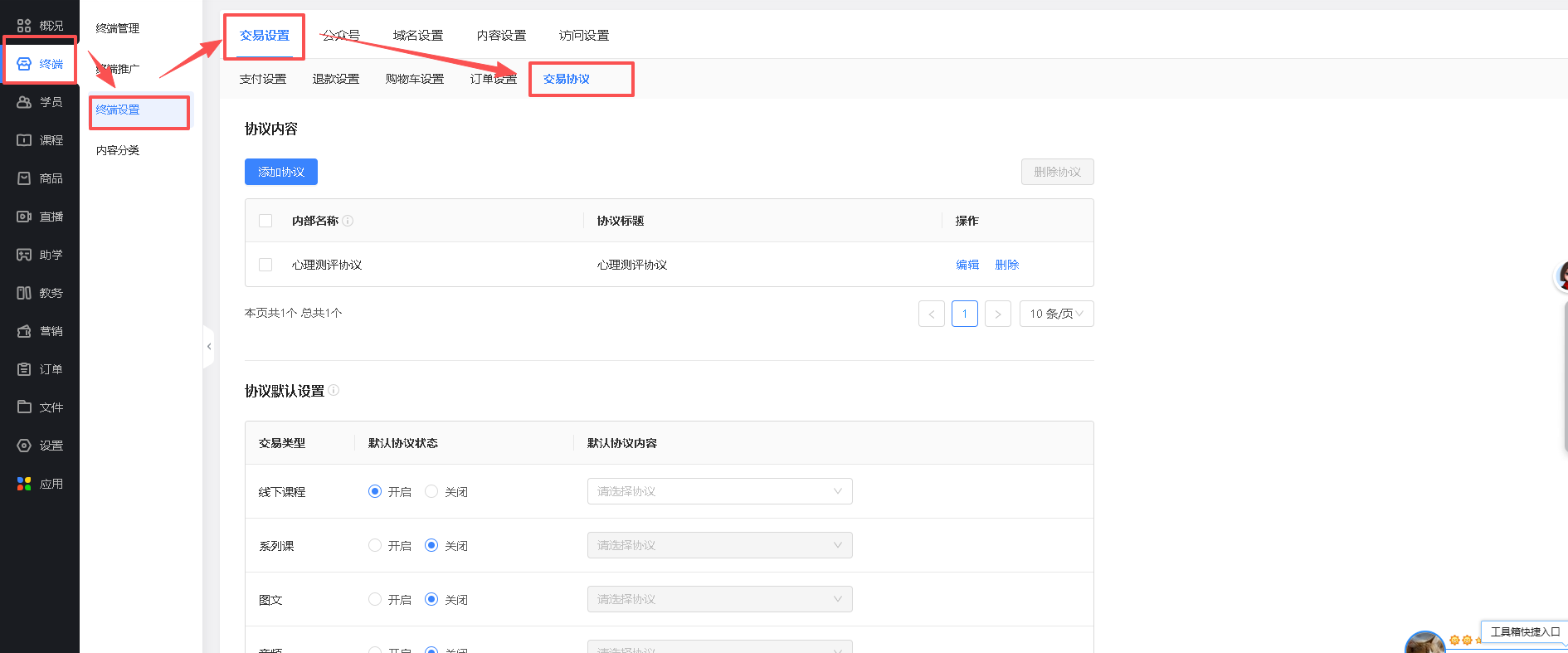 路径:管理后台-终端-终端设置-交易设置-交易协议