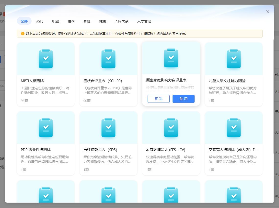 支持丰富的测评模板,一键使用模板,实现快速创建和上线测评活动