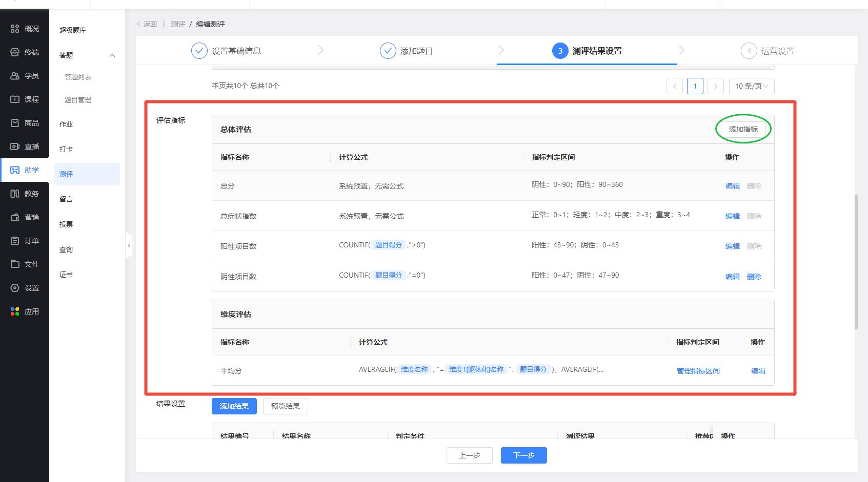 【自定义】方式下,可以自定义评估指标,指标可以自定义指标计算公式、指标的评估区间等,做到更加个性化的自定义测评;满足scl-90、艾克森等综合型测评场