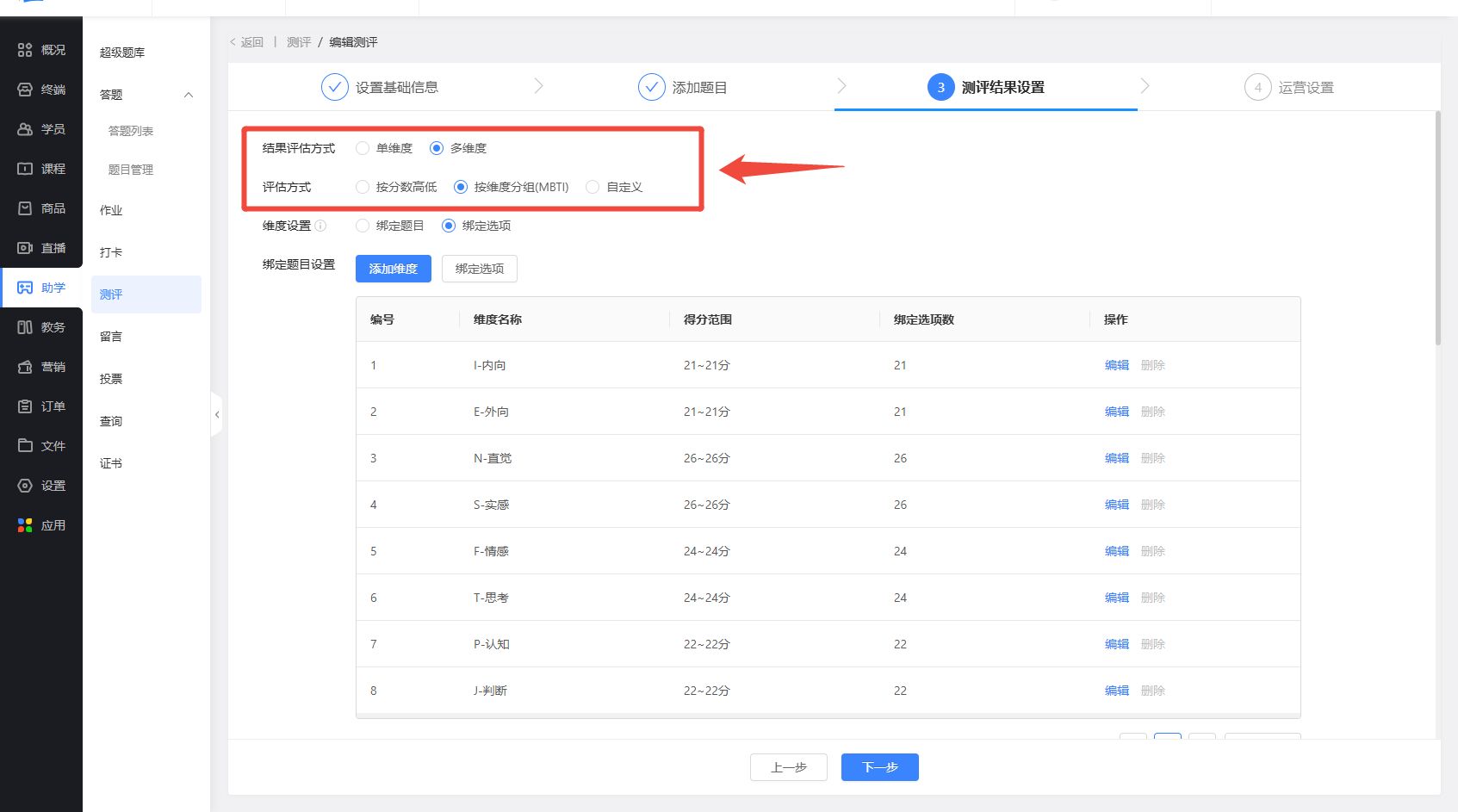 测评功能是面向心理咨询、企业培训、学员评估场景的标准化测试工具,支持创建心理/性格测试、职业测评、能力评估等活动