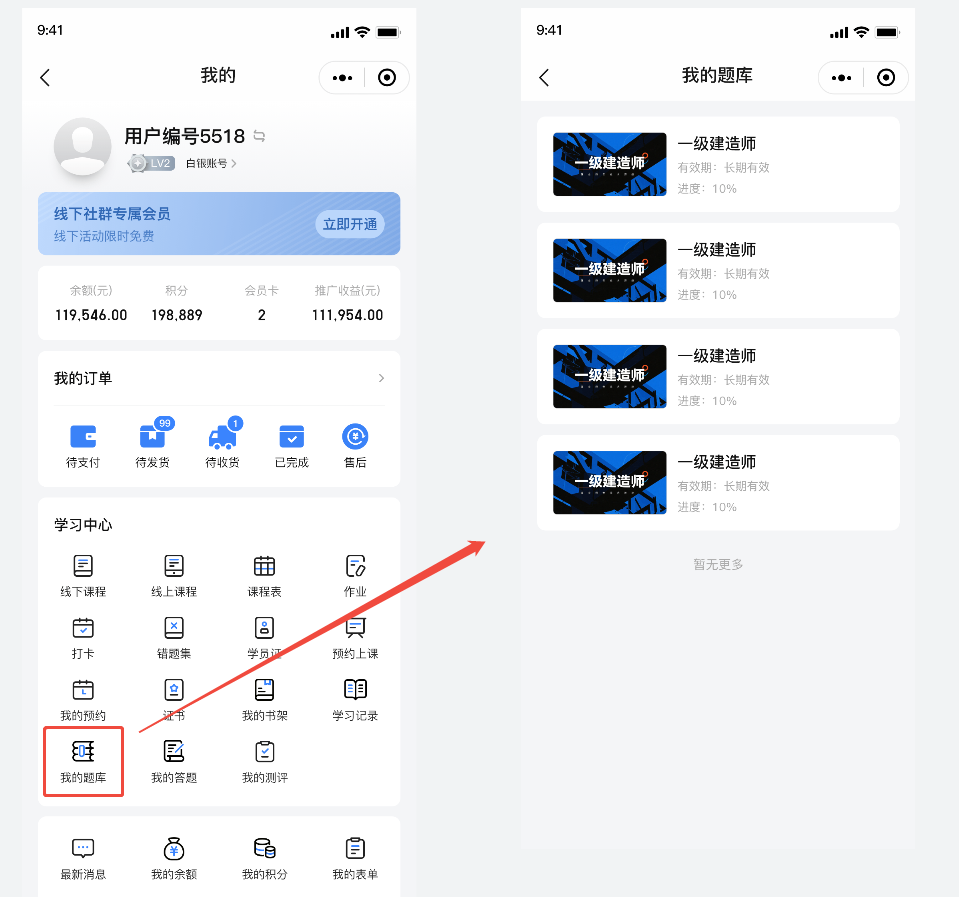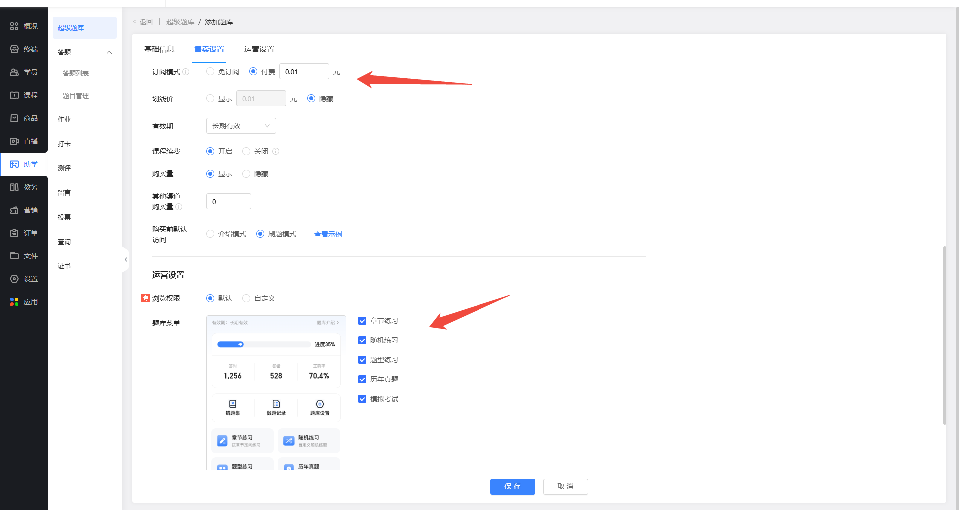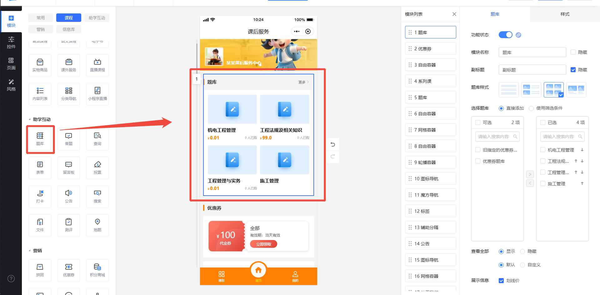 通过题库列表模块、题库列表页、链接控件等方式,可以在学员端设置题库的访问入口