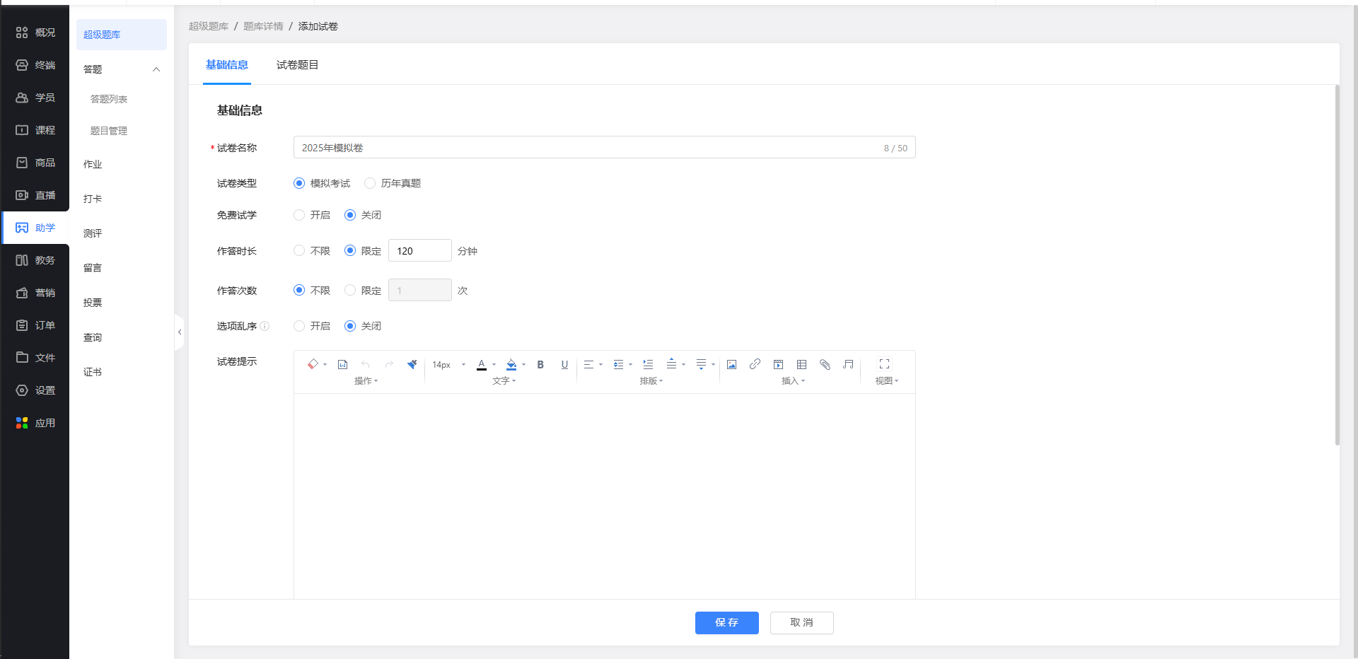 超级题库功能是面向职业资格考证、成人教育考试、考研、技能培训、K12、企业内训等行业的刷题练题系统,提供一站式的刷题练题解决方案