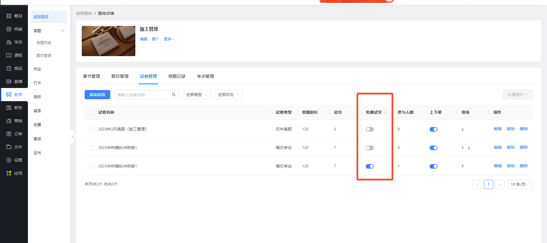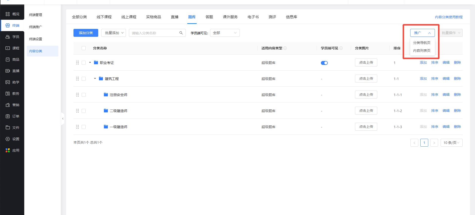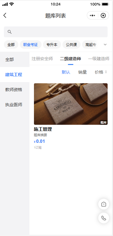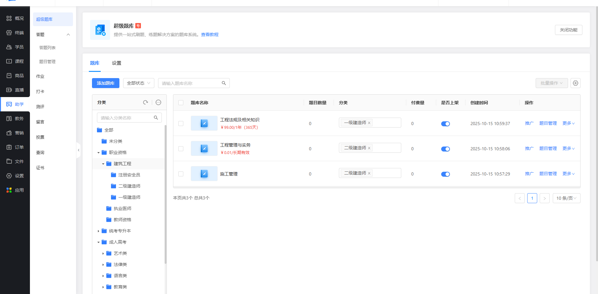 支持三层题库分类,实现考试分类示例:职业资格>建筑工程>二级建造师
