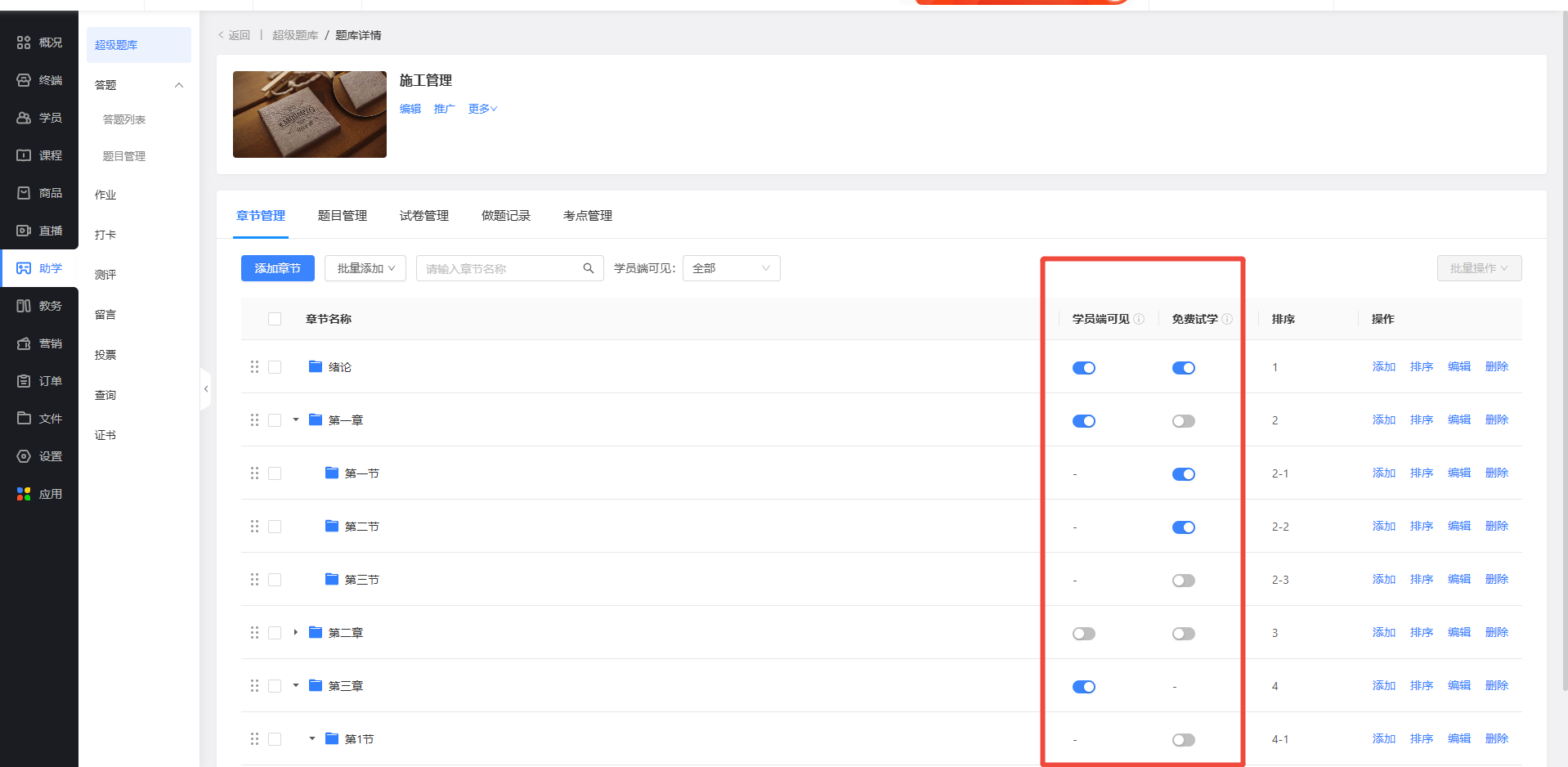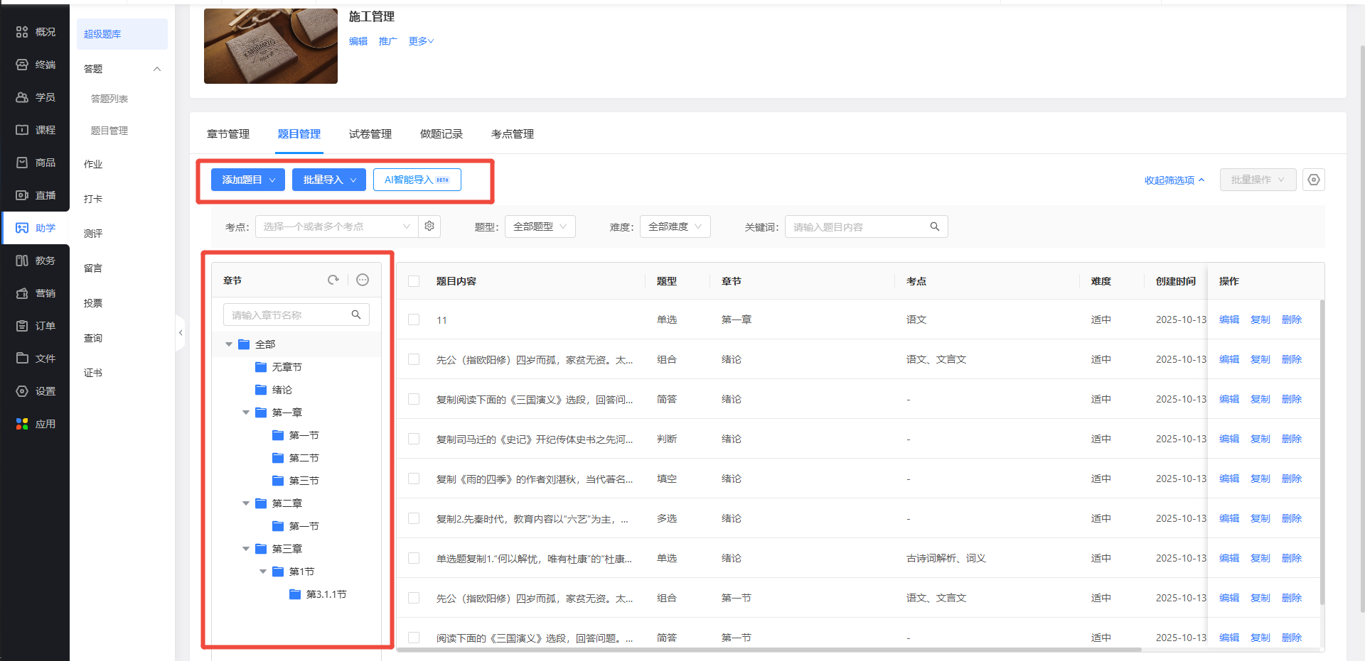 支持三层目录结构,实现题库结构示例:施工管理>第一章>第1节>第1.1小节