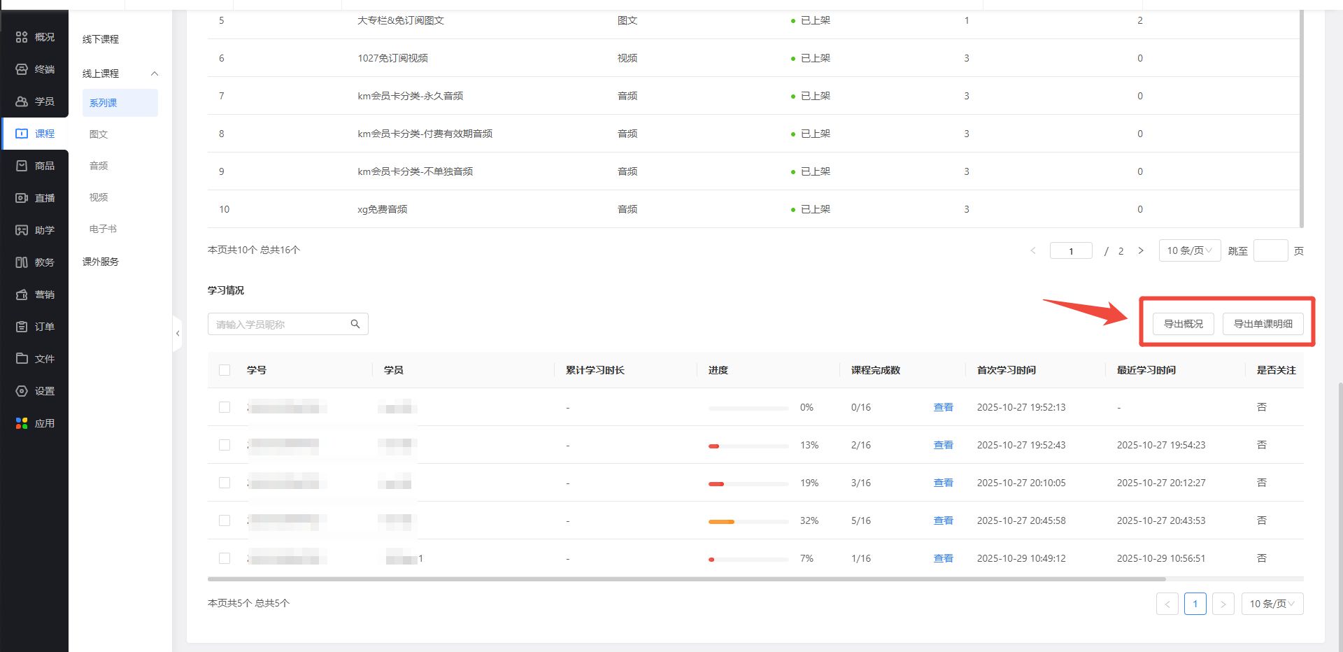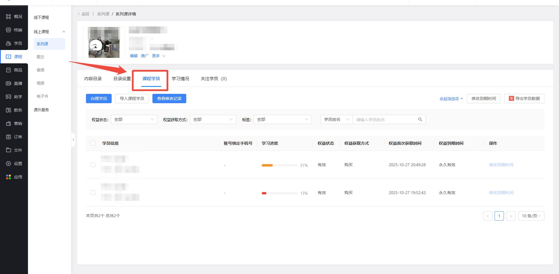 1、系列课、视频、音频和图文新增“课程学员”,支持显示所有拥有课程权益的学员;