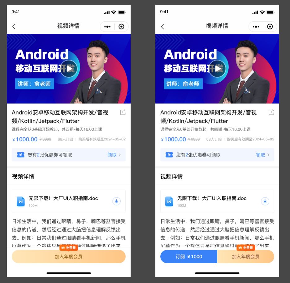 不单独订阅时,底部按钮显示为开通会员按钮;