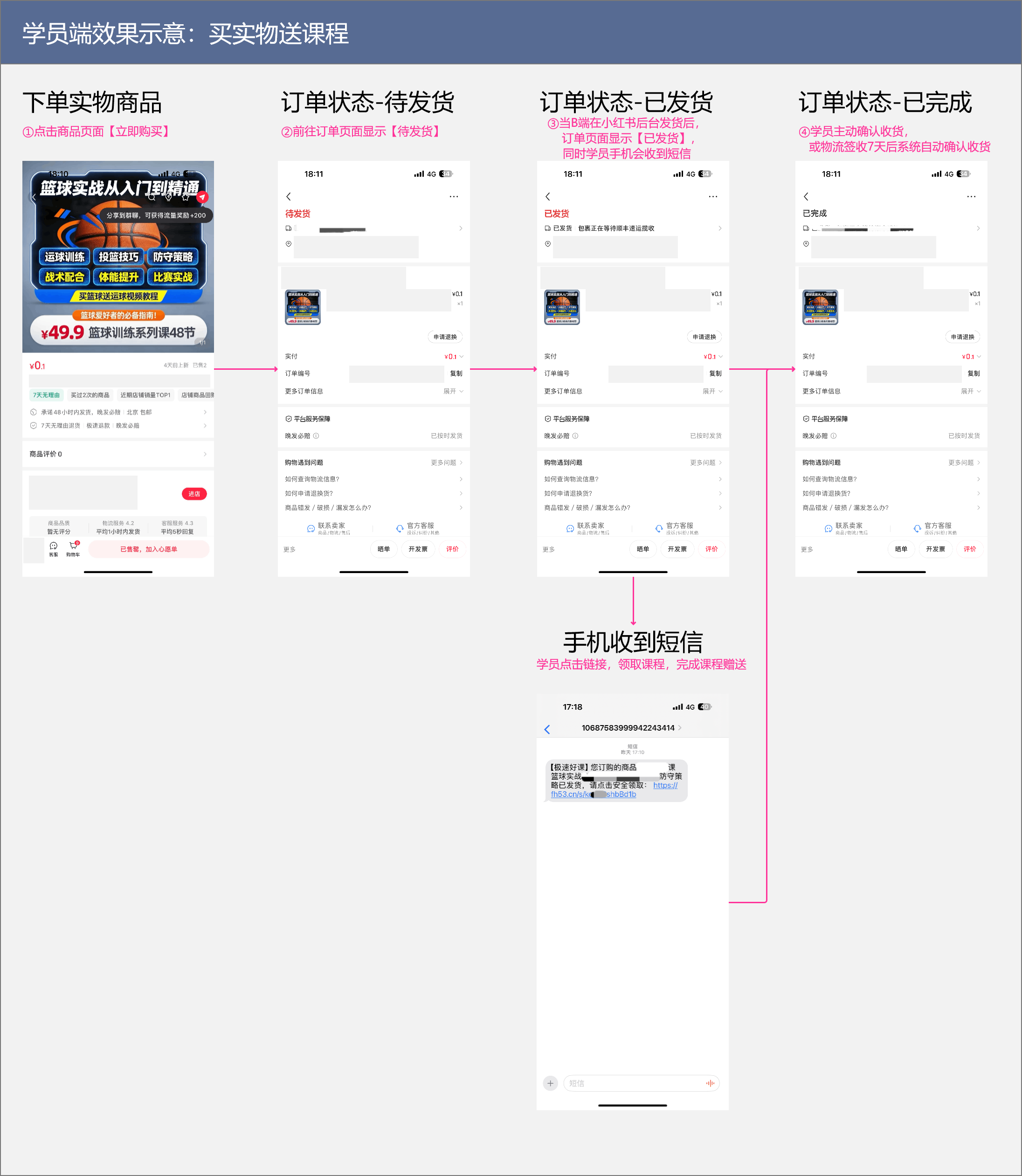 本教程仅演示【推荐方案:卖实物送课程】的发货配置,流程分为两个环节,环节一为配置短信自动送课程,环节二为设置订单物流发货;