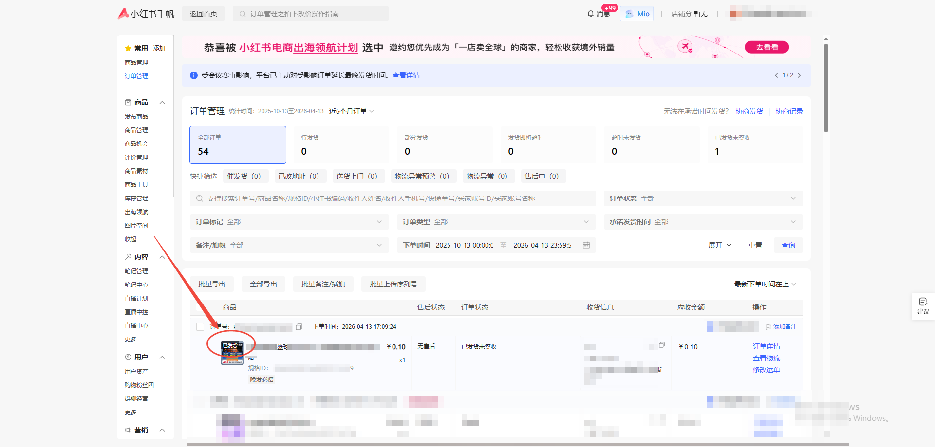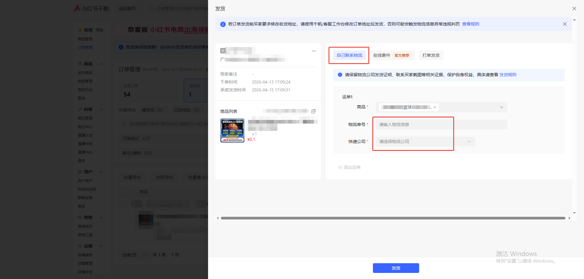 环节二:设置订单物流发货(每天定时登录小红书店铺后台设置)