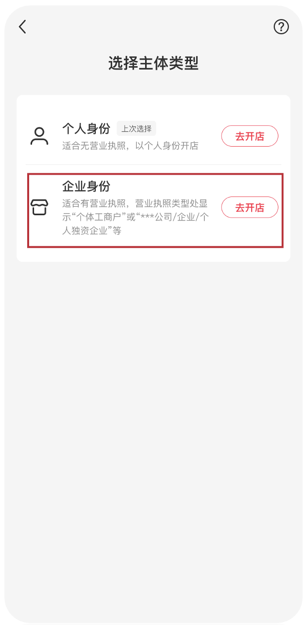 4.选择【企业身份】,点击【去开店】