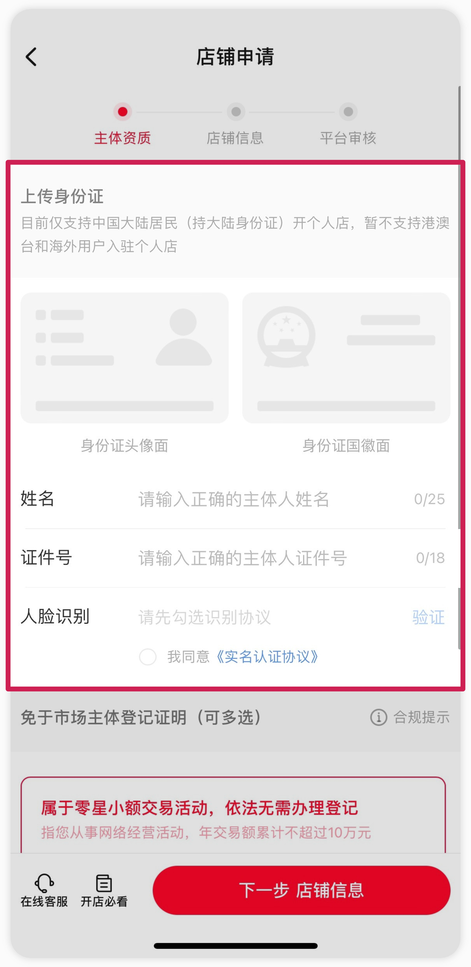 4.剩余流程和APP端一样,提交身份证、人脸识别、选择零星小额交易活动、商品类型选择电商商品、填写运营人及店铺信息,完成开店。
