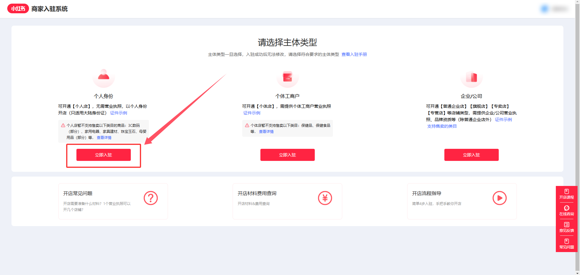 3.选择【个人身份】,点击【立即入驻】