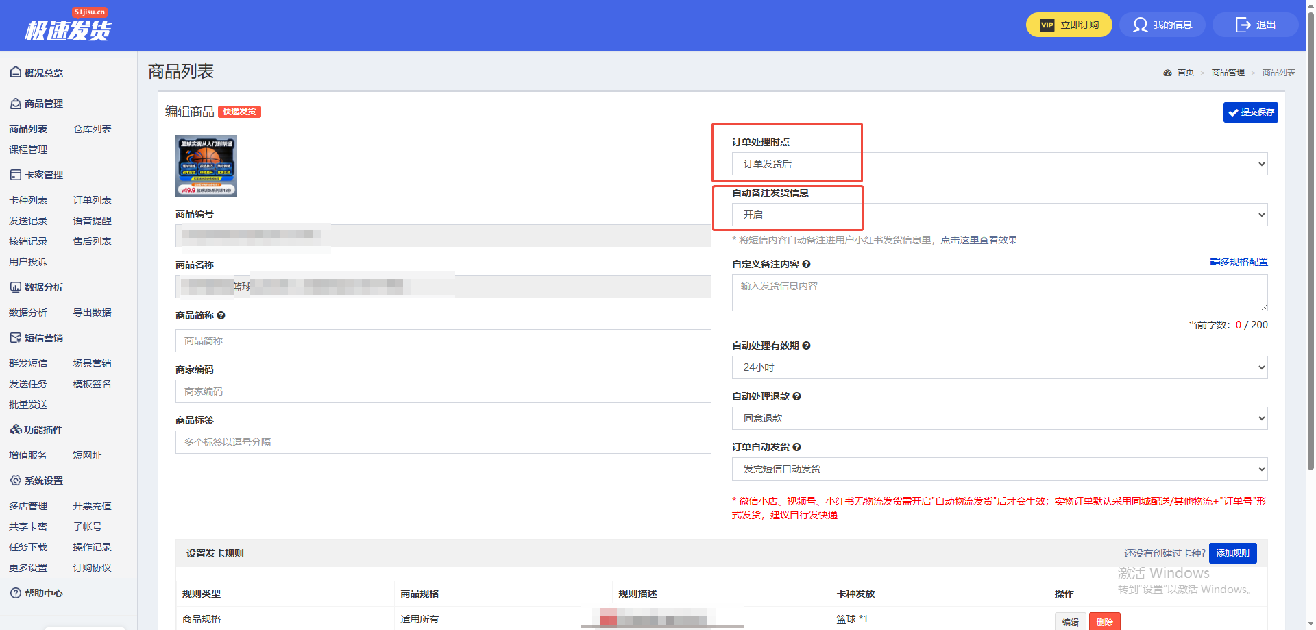 10.推荐开启以下商品自动处理开关,如无需求可跳过此步骤;【订单处理时点:选择订单发货后】(此项设置可以保证短信是物流发货后才推送课程给客户)