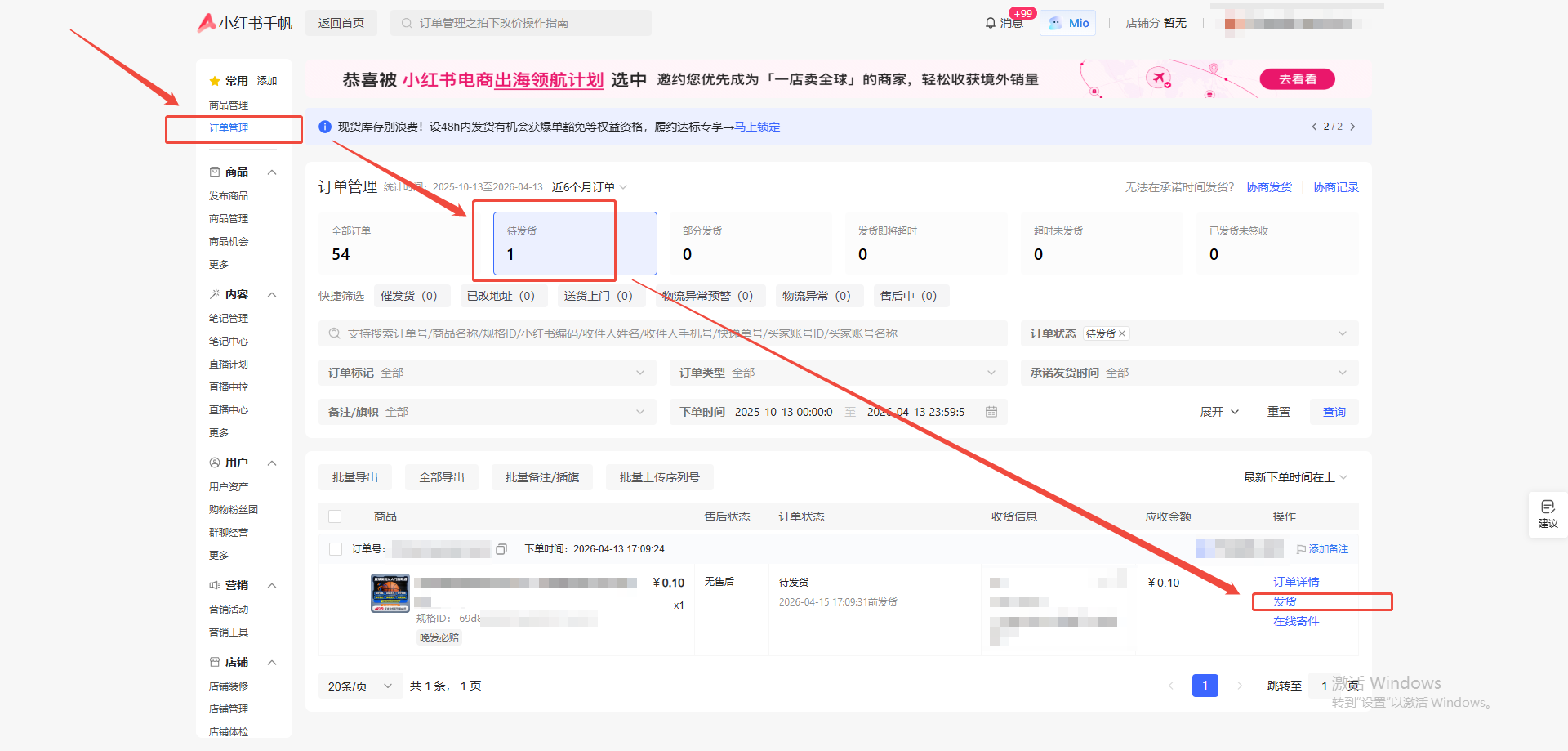 1.客户下单后,商家需登录小红书店铺后台,点击【订单管理】,点击【待发货】,点击订单右侧【发货】