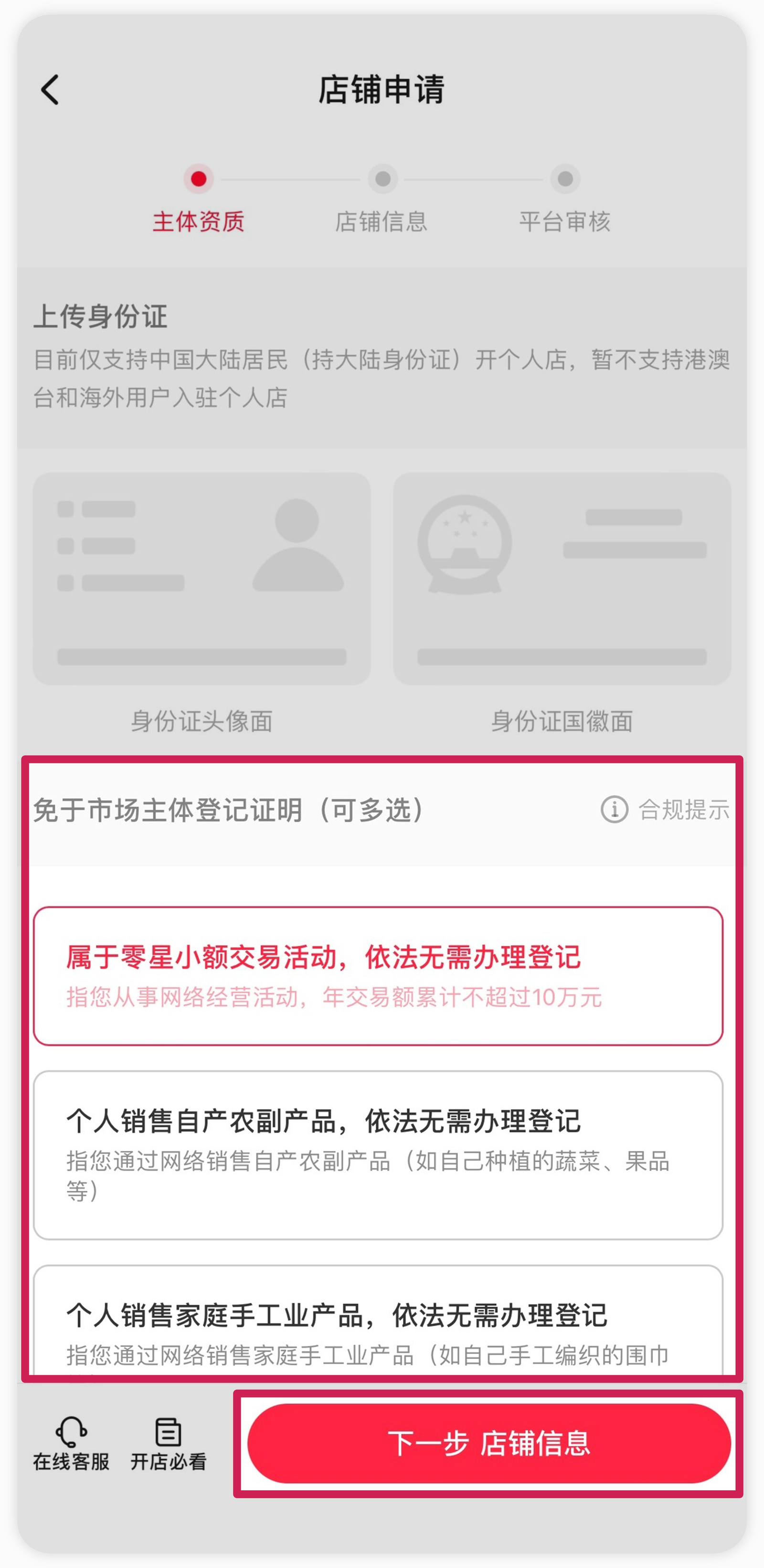 6.勾选免于市场主体登记证明(可多选),点击【下一步 店铺信息】,建议选择零星小额交易活动即可