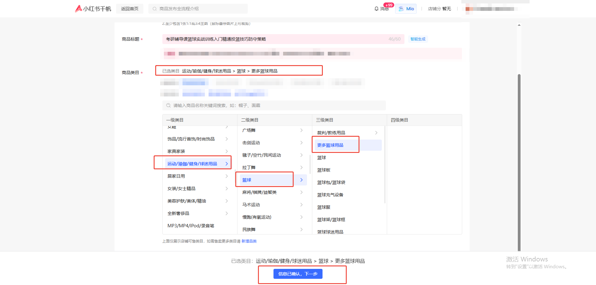 6.填写相关商品标题、图片、类目后,点击【下一步】
