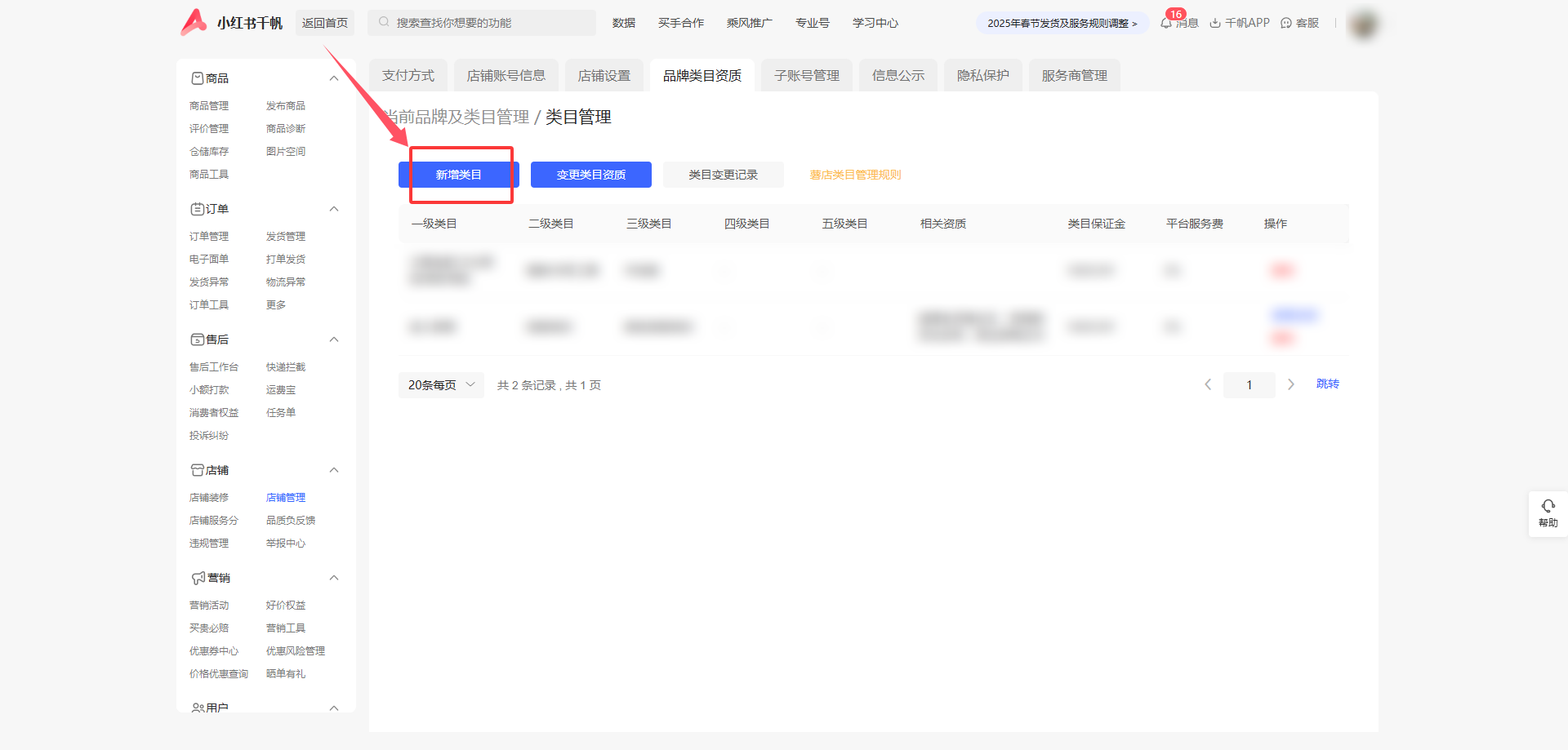 1.进入小红书店铺管理后台,点击右侧菜单栏【店铺管理】—【品牌类目资质】—【当前品牌及类目管理】,点击下方【类目管理】