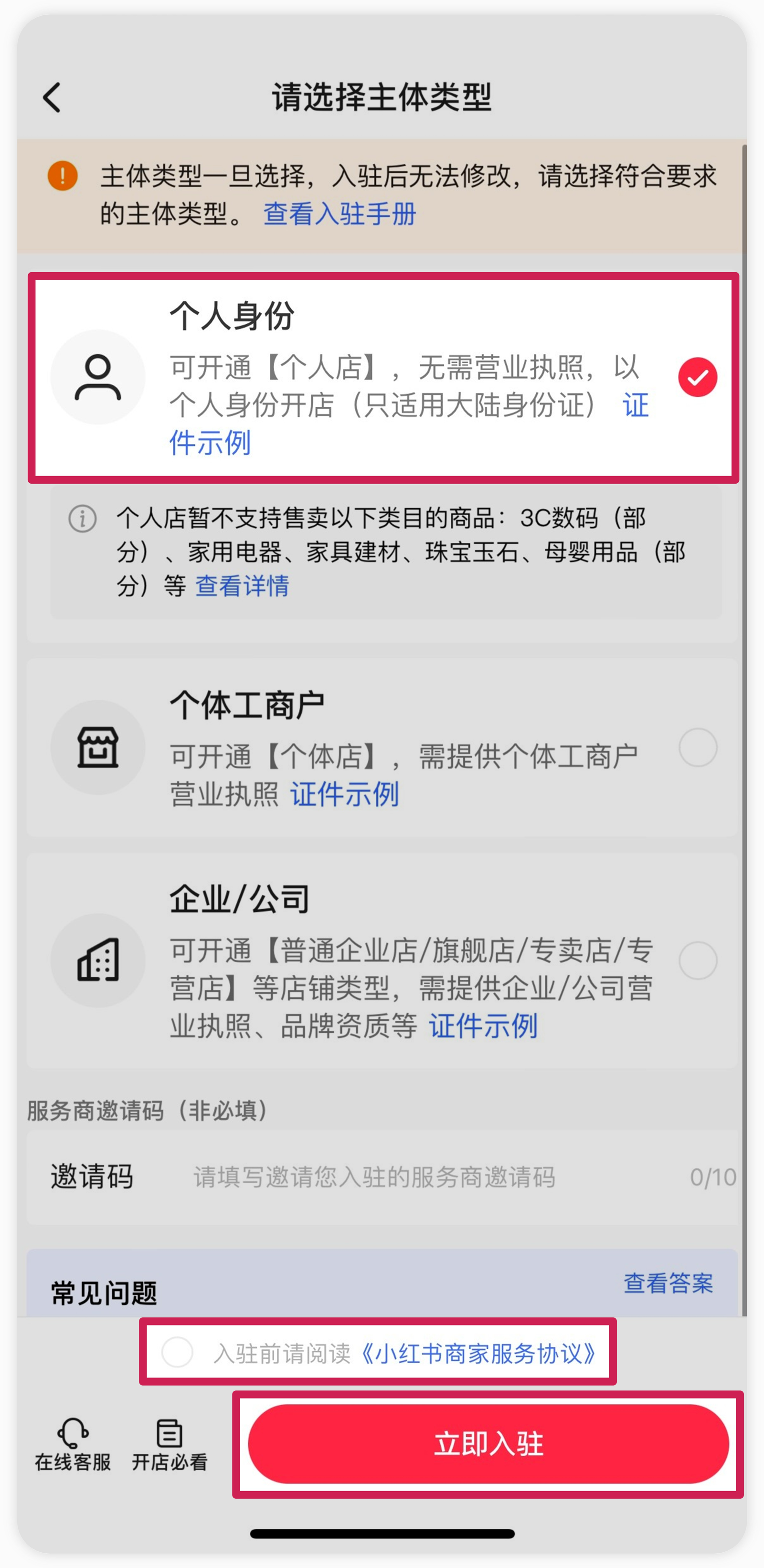 4.选择【个人身份】,入驻前请阅读《小红书商家服务协议》,点击【立即入驻】