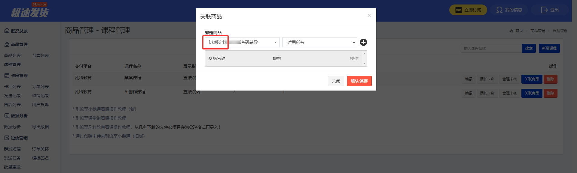 在课程管理页面,点击右侧的【关联商品】绑定平台商品(如果商品已关联非课程卡种,需前往“商品列表”-“编辑”-将其解绑)