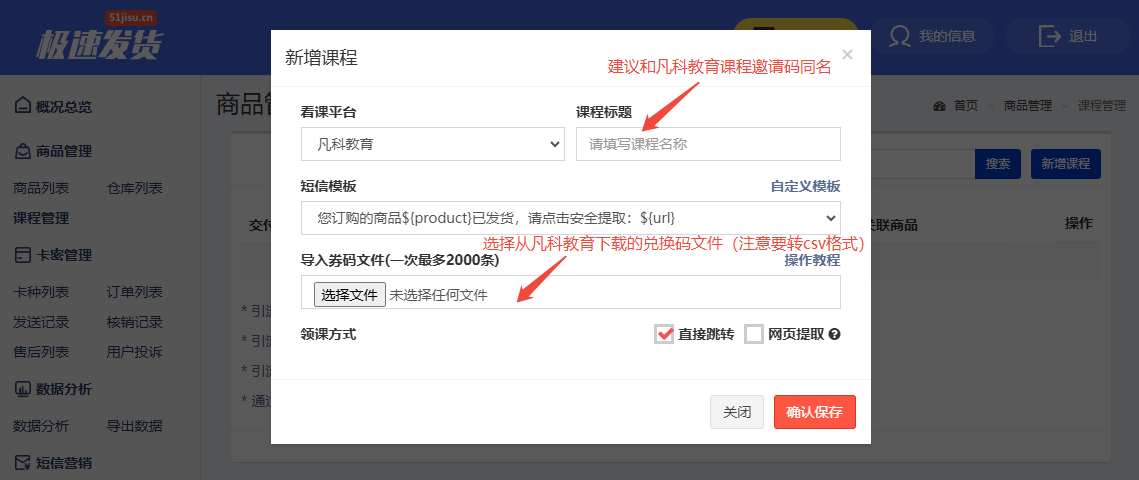 - 导入券码文件:选择凡科教育后台导出的码库文件(注意表格导出后要转格式为“CSV”,再导入此处)