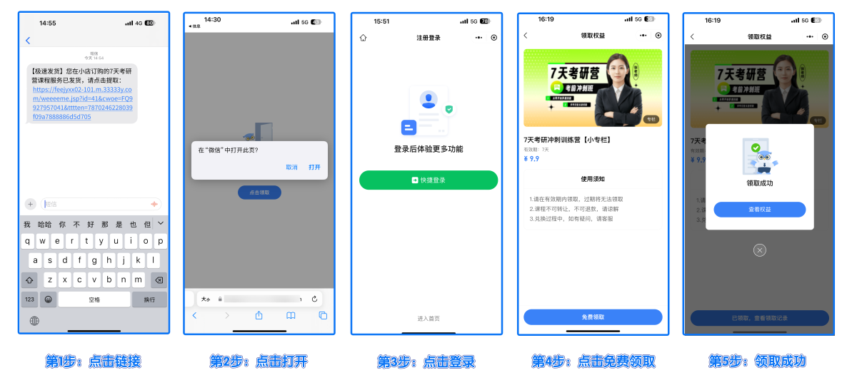 4.2 学员提交的订单手机号会收到第三方自动发货平台推送的发货短信,当学员点击短信链接后,即可免费领取课程进行观看学习
