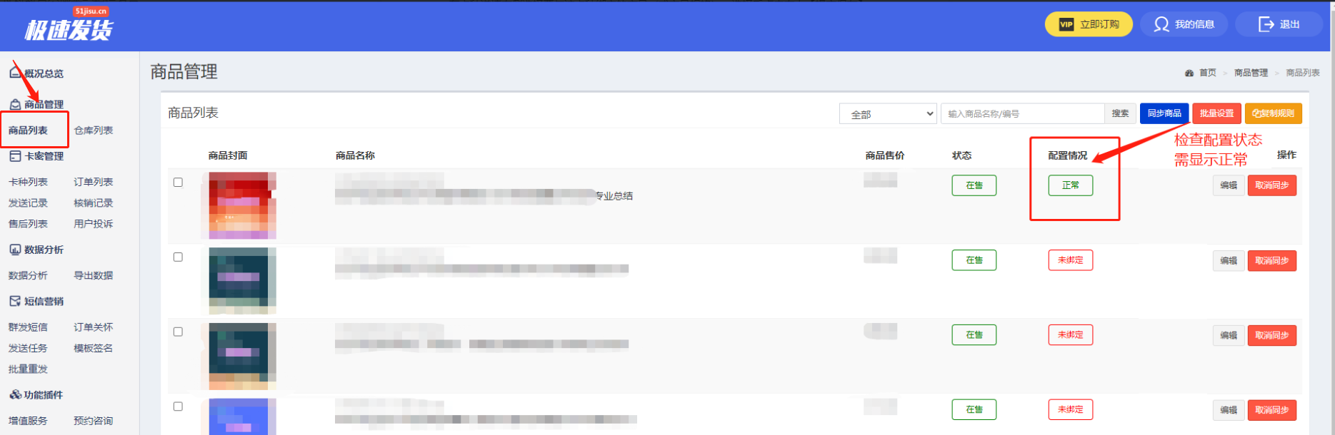 点击左侧菜单【商品列表】,查看刚才绑定的卡种商品状态,需显示正常