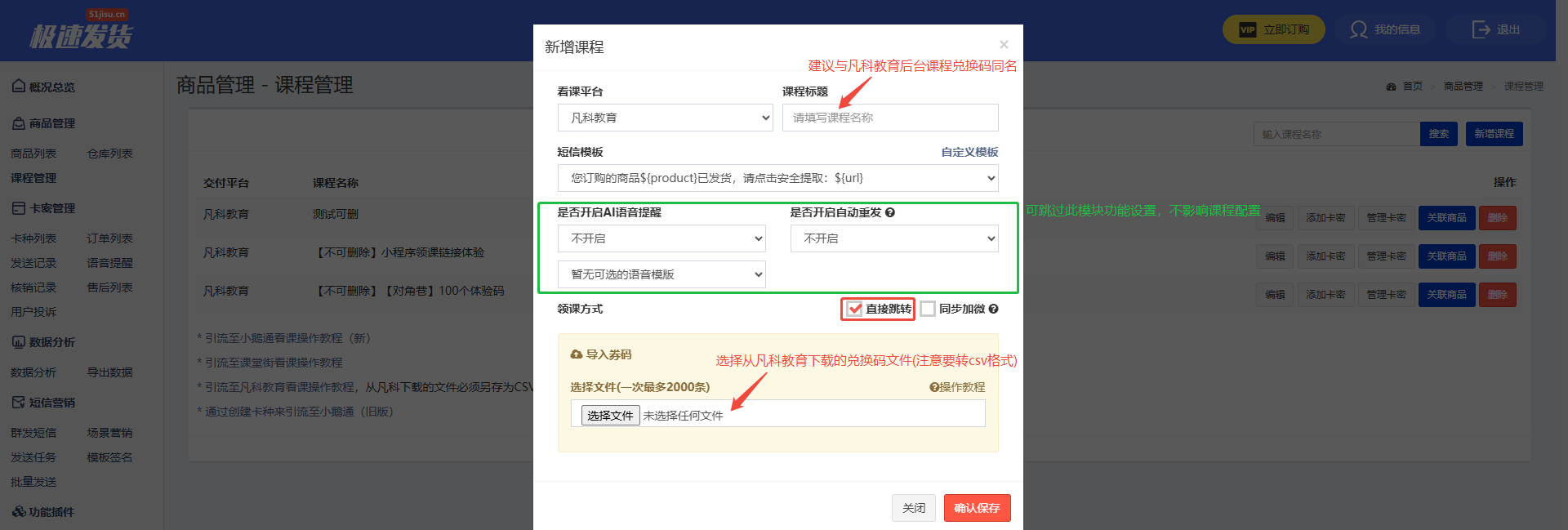 由于【极速自动发货】工具不支持生成“券码文件”,此时需要前往【凡科教育平台】创建课程兑换码后导入至此处。