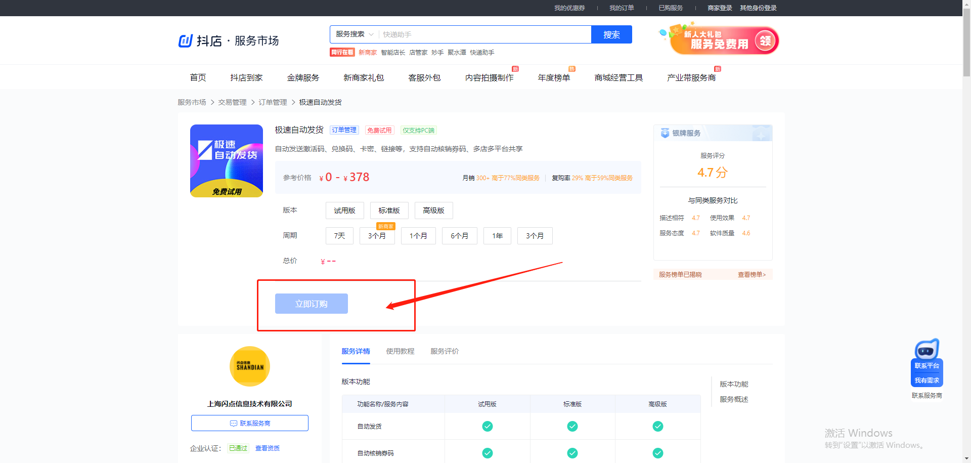 1.点击抖音店铺后台的【服务市场】,或访问【极速发货平台】,点击【前往获取】