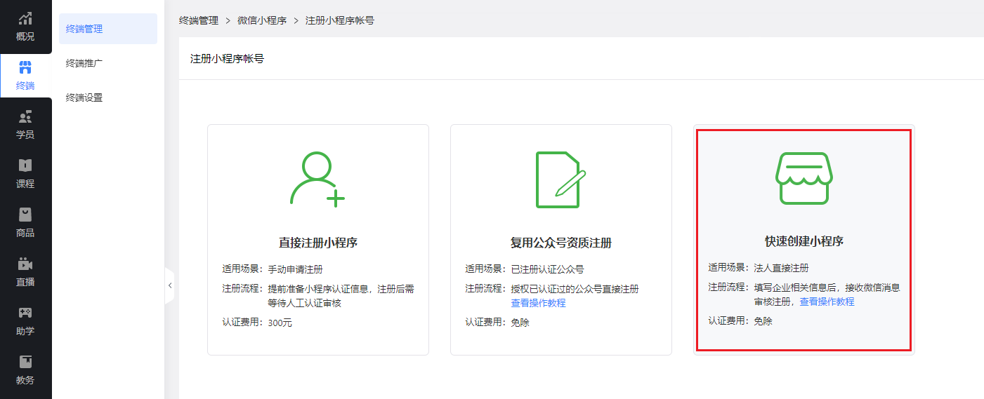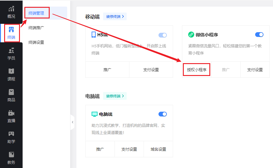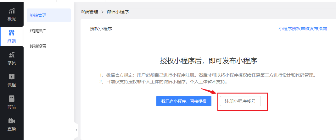 1.1 路径:管理后台-终端-终端管理-授权小程序