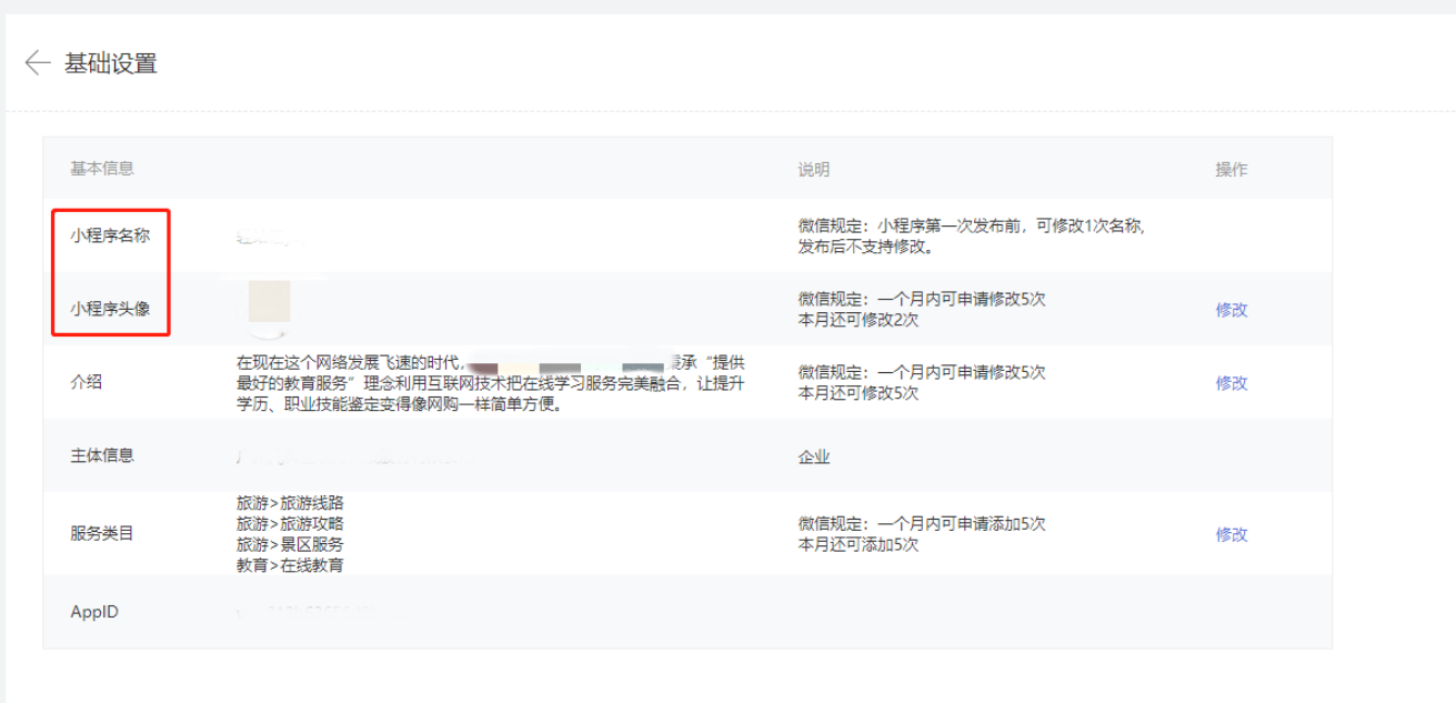 (包括:小程序名称、小程序头像、小程序介绍、小程序服务类目)