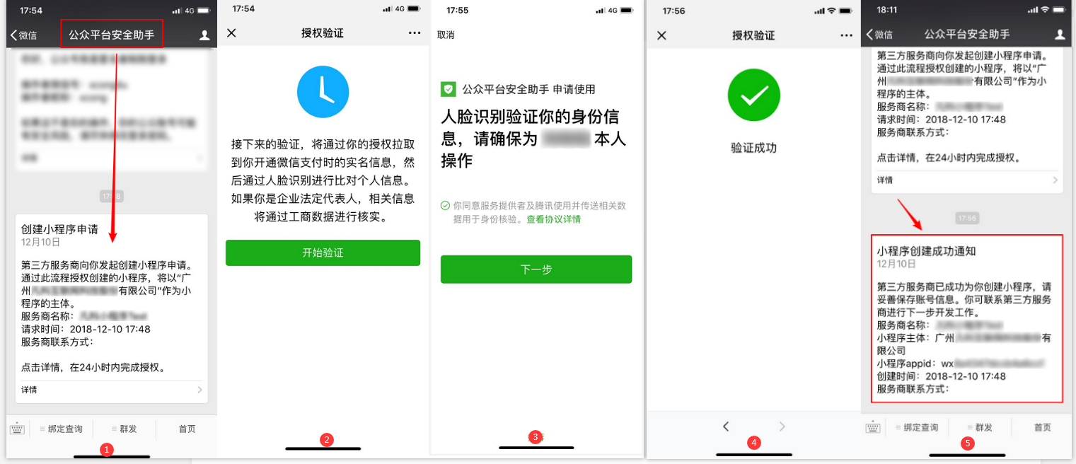 ⑤ 同时会收到【公众平台安全助手】下发的【小程序创建成功通知】