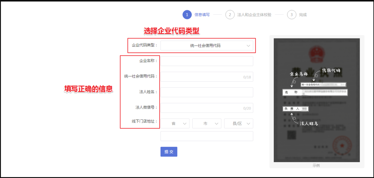 选择企业代码类型:支持三种类型,选择类型后参照右侧示例图,正确填写相关信息(务必确认信息正确再提交)。