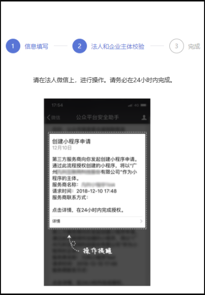 提交信息后,需在法人微信上进行法人和企业主体校验,请务必在24小时内完成。