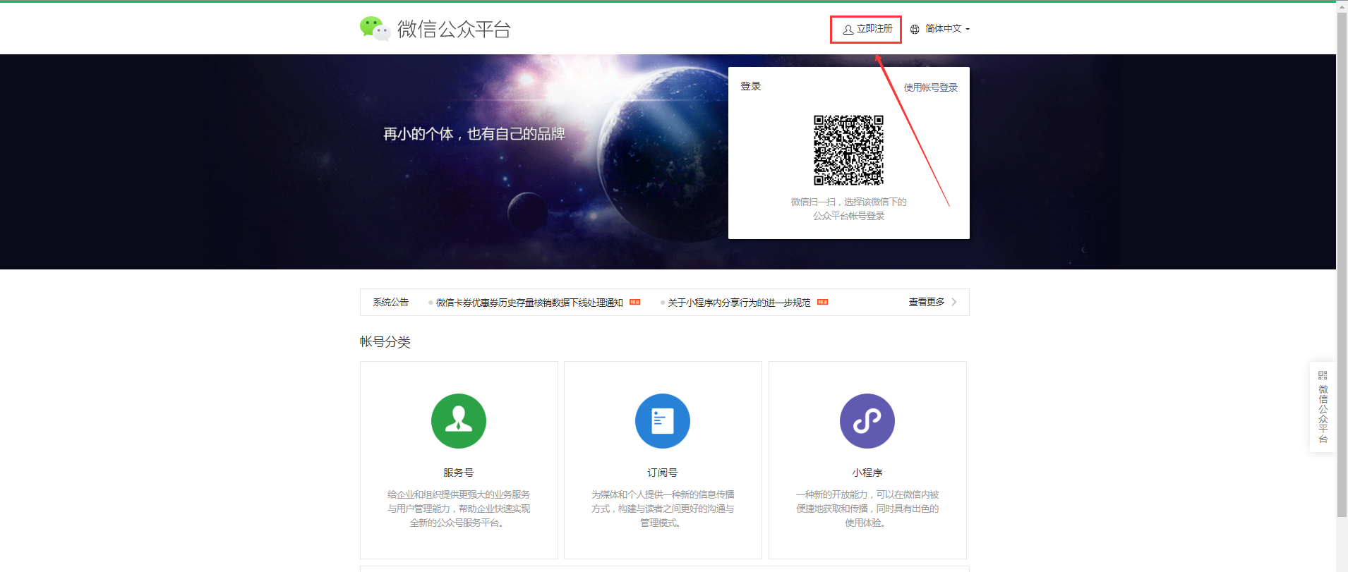 1.1 登录微信公众平台首页,在右上角点击【立即注册】。