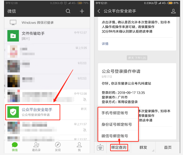 打开手机微信,进入【公众平台安全助手】的服务号中,在菜单栏中点击【绑定查询】。